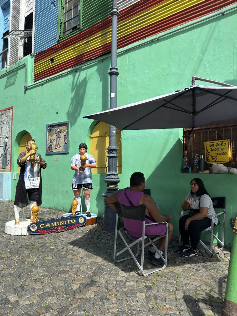 Intorno allo stadio decine di botteghe più o meno scalcagnate che offrono maglie del Boca ai turisti in pellegrinaggio. Statue di Maradona, Messi e altri calciatori – assieme all’immancabile Mafalda – sono collocate all’entrata dei negozi di souvenir.