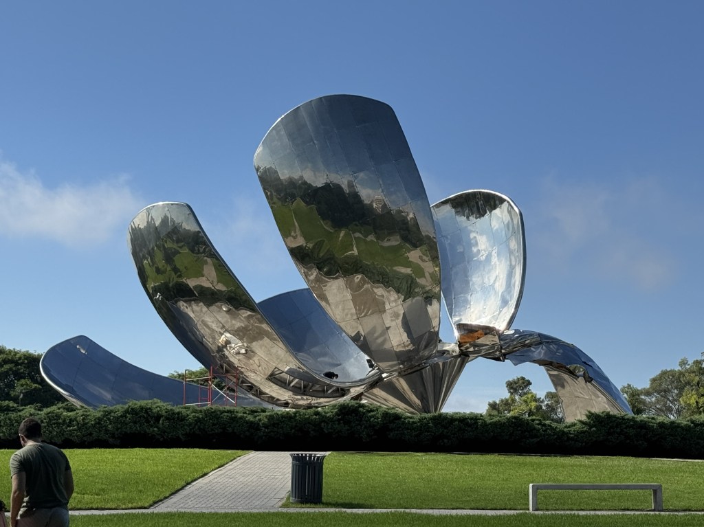 Solo qualche giorno prima del nostro arrivo, Buenos Aires è stata devastata da forti piogge che hanno causato grossi problemi alla popolazione. Centomila persone sono rimaste senza elettricità. La Floralis Generica, l’imponente scultura in alluminio e acciaio che raffigura il fiore nazionale dell’Argentina, il fiore di ceiba, ha perso alcuni petali. Si tratta di un fiore meccanico, progettato dall’architetto argentino Eduardo Catalano che decorava un parco nella Plaza de las Naciones Unidas; si apriva al mattino e chiudeva alla sera, come un vero fiore.